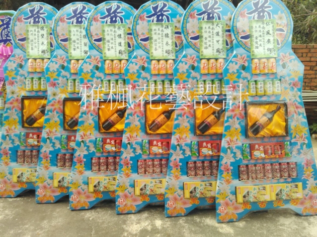 規格:七層平面弔唁罐頭籃系列,高度約170公分,歡迎指定內容物製做,可另行報價。